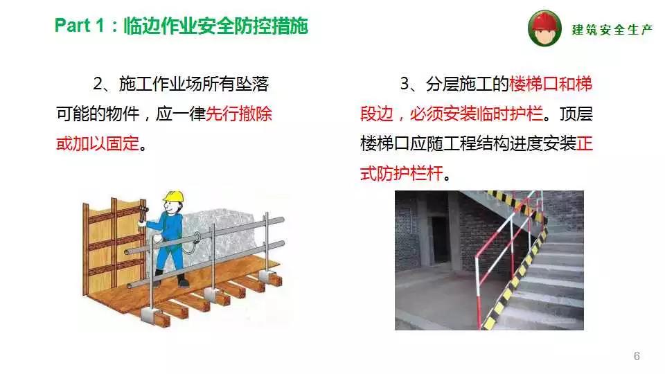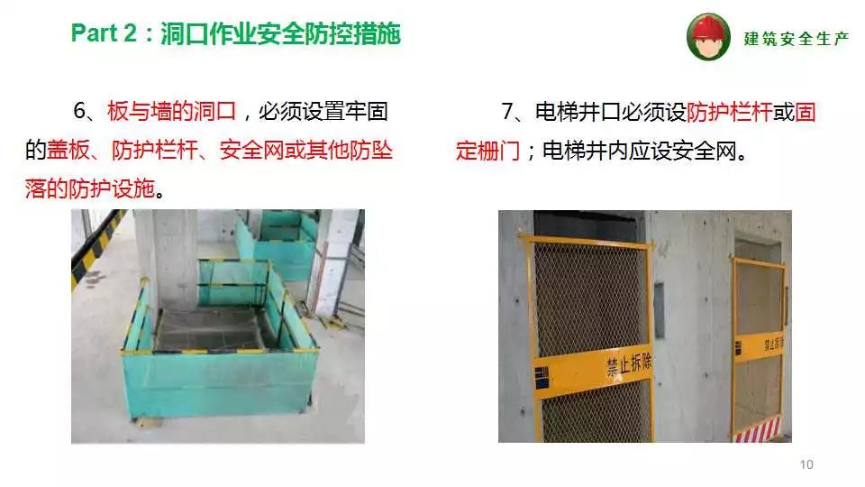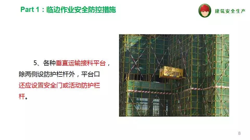 8、嚴(yán)格執(zhí)行高處作業(yè)五個(gè)必有“有邊必有欄,有洞必有蓋,有欄無(wú)蓋必有網(wǎng),有電必有防護(hù)措施,電梯必有門(mén)”。