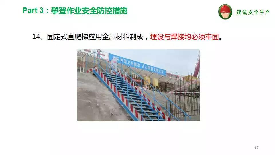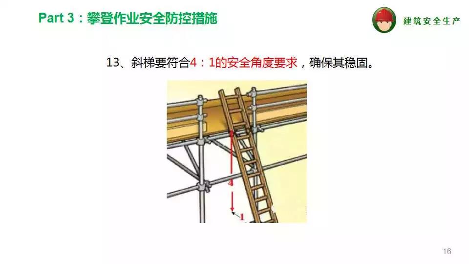 1、上下梯子必須結(jié)構(gòu)牢固,有護(hù)欄,并需經(jīng)常檢查,確保安全可靠,高度較高的爬梯,中間應(yīng)設(shè)若干平臺(tái)。