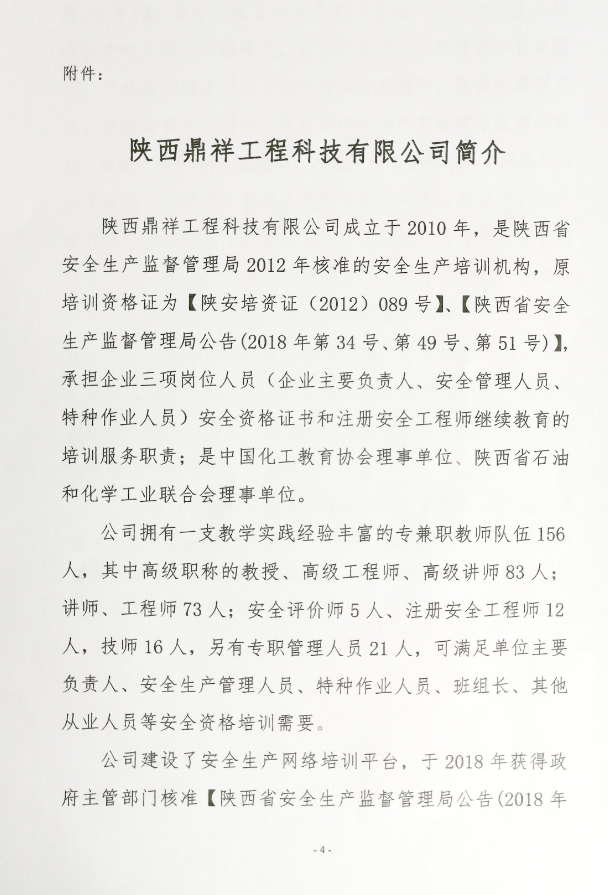 陜西鼎祥始終致力于“以安全科學(xué)技術(shù)為核心,國家安全生產(chǎn)法律法規(guī)為準(zhǔn)則,企業(yè)安全文化為靈魂,創(chuàng)新安全培訓(xùn),提升安全技能,為生命安康護(hù)航”。通過與政府主管部門、企業(yè)之間的協(xié)同效應(yīng),提升安全培訓(xùn)效果!促進(jìn)企業(yè)安全文化建設(shè)不斷發(fā)展!我們將孜孜追求、不懈努力,提升從業(yè)人員安全意識(shí)與安全技能,為客戶創(chuàng)造更為安全的生產(chǎn)條件。
