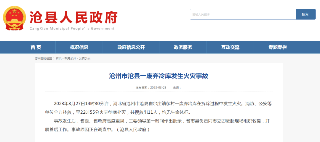 2023年3月27日14時30分許,河北省滄州市滄縣崔爾莊鎮(zhèn)東村一廢棄冷庫在拆除過程中發(fā)生火災(zāi)。